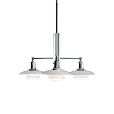 Materiale: Skærme i mundblæst hvidt opalt glas med stel og fatningshus i højglansforkromet messing og aluminium. Dimension: Diameter 596mm, højde 551mm (inkl. pendelrør). |
